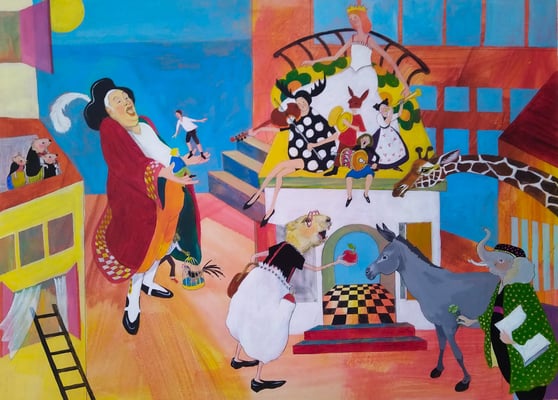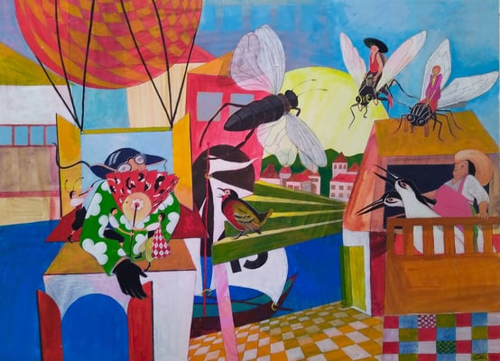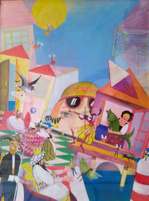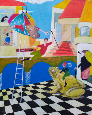 Auf den fantasievollen, farbenfrohen Acrylbildern von Cornelia Heinzel-Lichtwark findet man viele Details und Geschehnisse, die gleichzeitig passieren. Bei längerer Betrachtung sieht man, wie bei Wimmelbildern, immer wieder neue Objekte und kann damit neue Geschichten entstehen lassen.